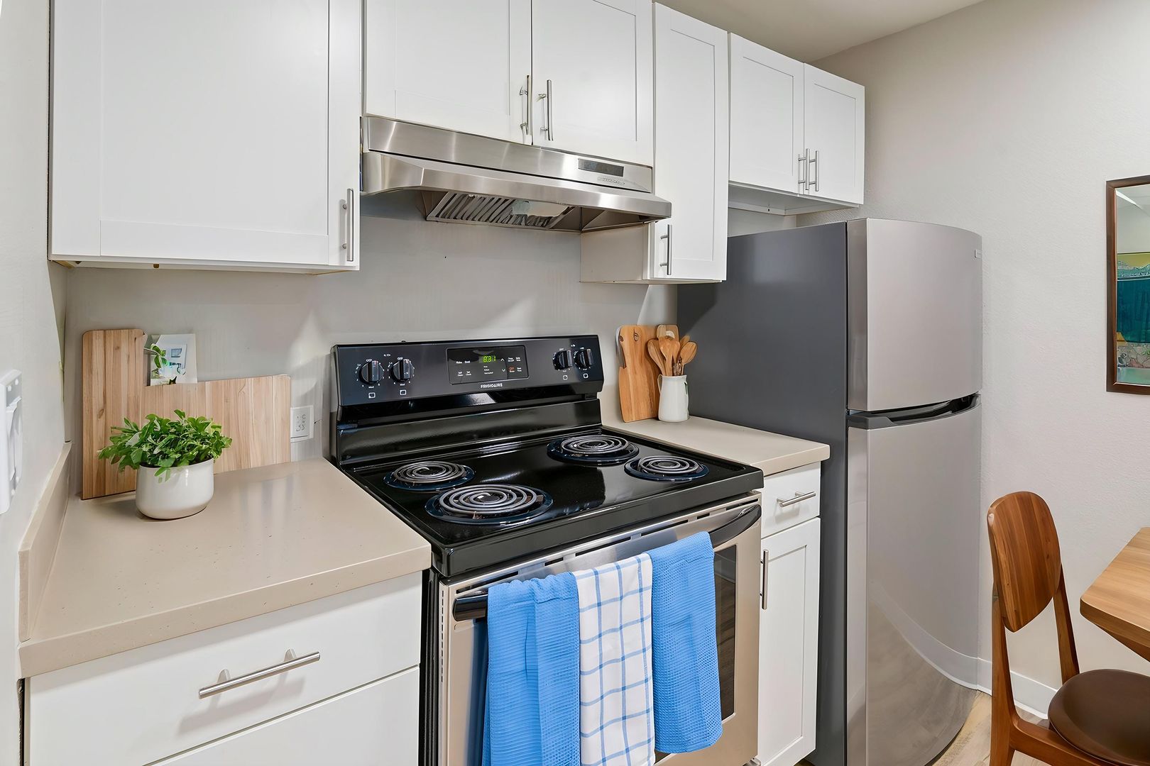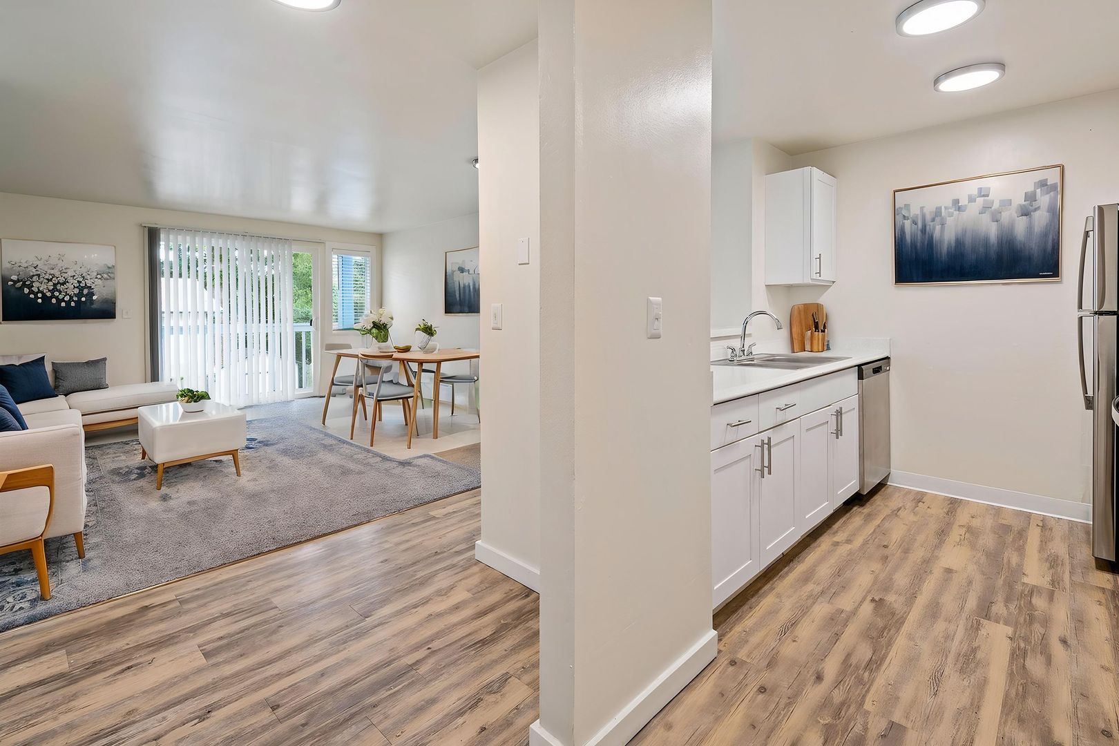 Discover your perfect retreat in this charming 1-bedroom apartment! Featuring bright white cabinets and sleek stainless-steel appliances, the kitchen is both stylish and functional. Enjoy cozy carpeted living spaces, complemented by light-brown LVP in the kitchen and entry. Abundant natural light fills the rooms, highlighting the elegant white doors and baseboards, along with warm beige countertops. Experience comfort and modern living in this inviting space!