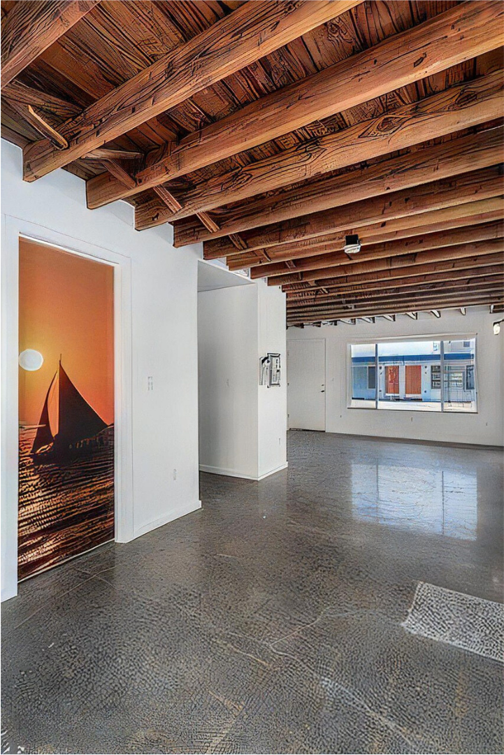 The restoration project thoughtfully preserved key architectural elements, including the original brick facade, rustic wood ceilings, and concrete floors, creating a sophisticated and timeless aesthetic.