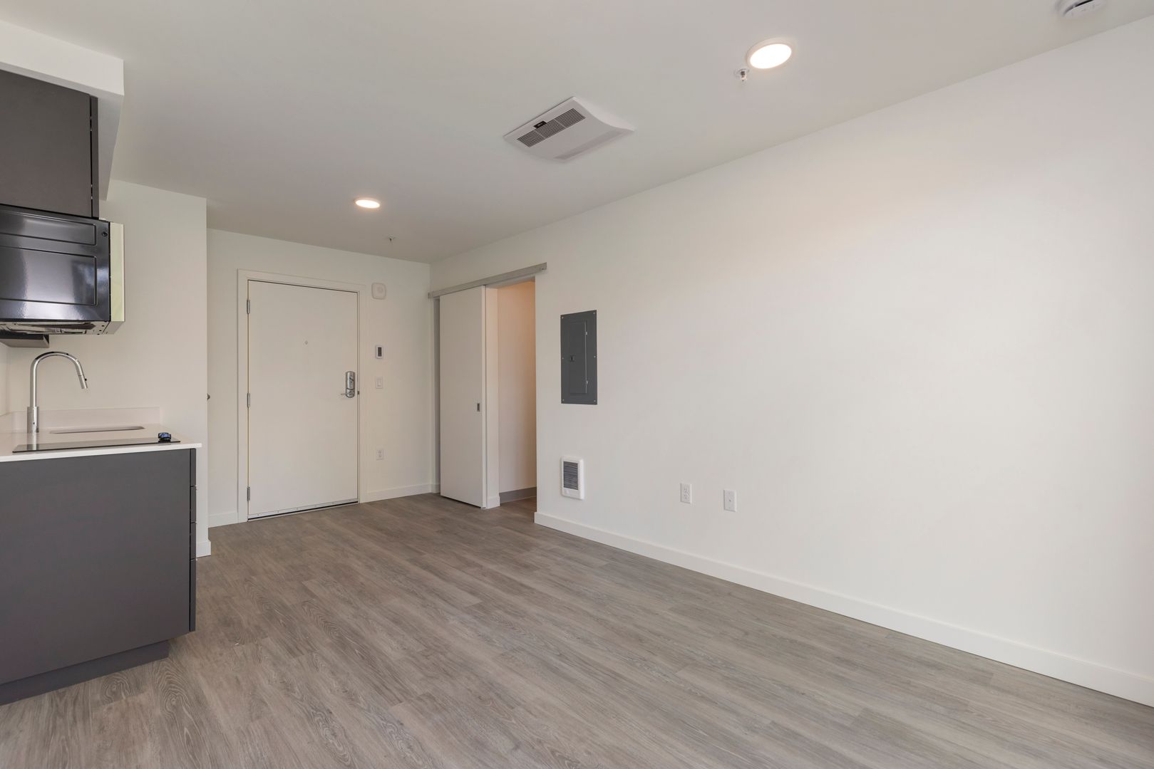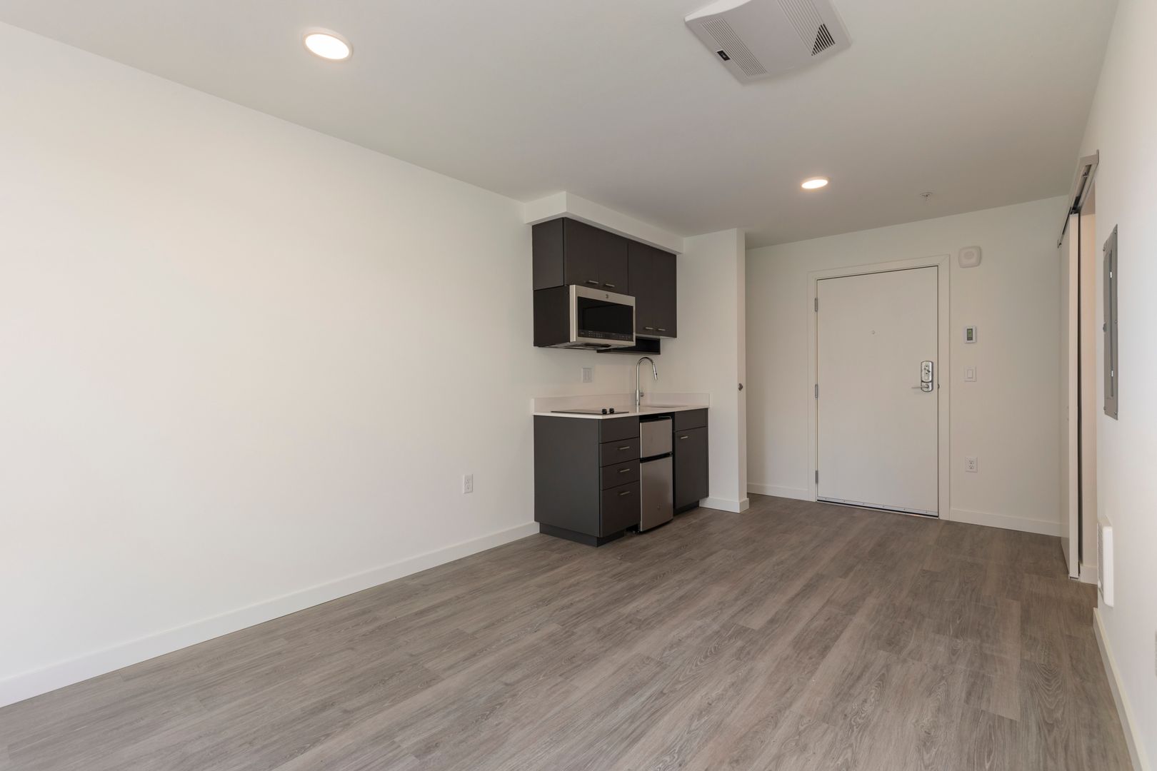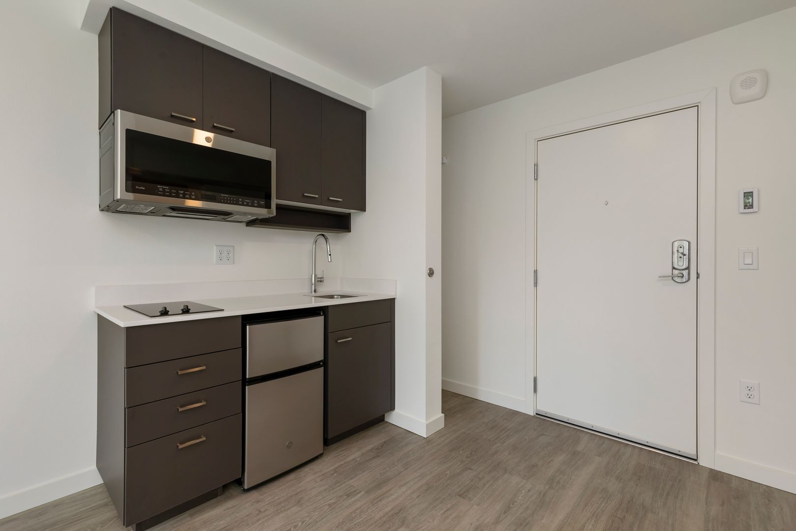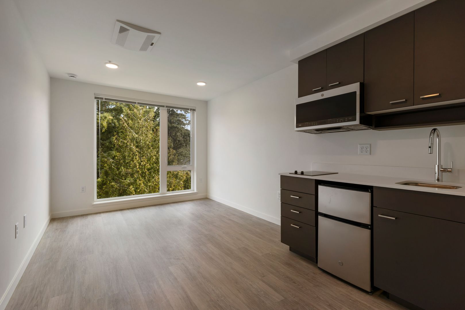 Explore our recently constructed micro studio apartments featuring hardwood-like vinyl plank flooring, contemporary finishes, and generously sized windows that allow ample natural light to illuminate the space. In our efficient kitchens, you'll find brand-new stainless-steel appliances, a built-in two-burner stovetop, and a convection microwave for your convenience. Each unit is thoughtfully designed with open-concept storage solutions and a full-size vanity in the bathroom, ensuring you have plenty of space to store your belongings while maintaining a minimalist and tidy living environment.